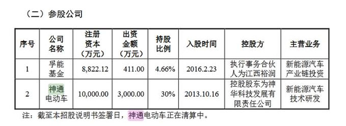 孚能科技招股說(shuō)明書(shū)還披露參股了神通電動(dòng)車能源管理有限公司,這家公司成立于2013年10月16日,注冊(cè)資本10000萬(wàn)元。招股書(shū)顯示,孚能科技2013年10月16日出資3000萬(wàn)元,占注冊(cè)資本的30%,公司的控股方為神華科技發(fā)展有限公司,目前該公司正在清算中。