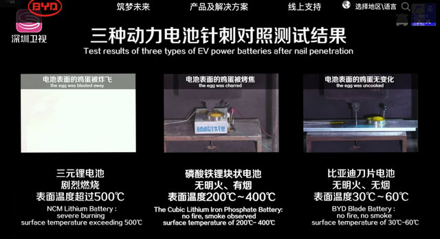 比亞迪在發(fā)布會當天播放了磷酸鐵鋰刀片電池接受穿刺試驗的視頻,在同樣的測試條件下,三元鋰電池在針刺瞬間出現(xiàn)劇烈的溫度變化,表面溫度迅速超過500℃,并發(fā)生極端的熱失控——劇烈燃燒現(xiàn)象。而比亞迪“刀片電池”在穿透后無明火、無煙,電池表面的溫度僅有30-60℃左右。