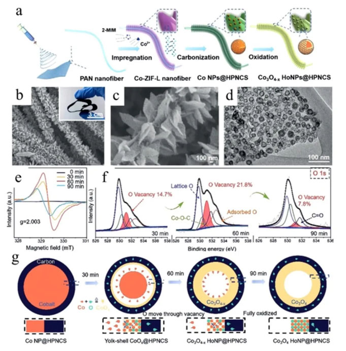鋰空氣電池(Li-O2)和鋅空氣電池(Zn-Air) 具有較高的理論能量密度,被認(rèn)為是最具有前景的能量存儲(chǔ)設(shè)備。與鋰離子電池不同,鋰空氣電池先放電再充電實(shí)現(xiàn)電池的循環(huán)。放電時(shí),負(fù)極的鋰金屬發(fā)生氧化反應(yīng)失去一個(gè)電子,逐漸成為游離態(tài)的Li+離子。在電解液的遷移作用下,Li+離子通過電解液到達(dá)多孔空氣正極參與反應(yīng)。鋰離子和電子不斷遷移到空氣正極,空氣正極具有多孔結(jié)構(gòu),通過空隙傳輸O2與其發(fā)生氧還原反應(yīng)生成Li2O2。隨著放電的進(jìn)行,放電產(chǎn)物L(fēng)i2O2會(huì)在空氣正極沉積積累。充電時(shí),在外加電壓作用下,多孔正極沉積的放電產(chǎn)物L(fēng)i2O2會(huì)發(fā)生氧化分解反應(yīng),生成Li+并釋放出氧氣,實(shí)現(xiàn)電池的可逆循環(huán)。對(duì)于可充電的鋅空氣電池,放電時(shí)金屬電極上產(chǎn)生的鋅離子可能與堿性電解液中的OH-發(fā)生進(jìn)一步反應(yīng)。值得注意的是,空氣電極是決定大多數(shù)金屬-空氣電池儲(chǔ)能性能的關(guān)鍵因素。然而,空氣電極放電過程中的氧還原反應(yīng)(ORR)和充電過程中的氧析出反應(yīng)(OER)等動(dòng)力學(xué)過程緩慢,極大地阻礙了金屬空氣電池的實(shí)際應(yīng)用。近年來,缺陷工程被報(bào)道為促進(jìn)電催化反應(yīng)動(dòng)力學(xué)、調(diào)節(jié)表面電子結(jié)構(gòu)和增強(qiáng)電荷轉(zhuǎn)移、促進(jìn)催化劑活性提供了充足的活性位點(diǎn)。雜原子摻雜和空位缺陷對(duì)金屬-空氣電池氧電極催化劑的影響引起了廣泛關(guān)注。