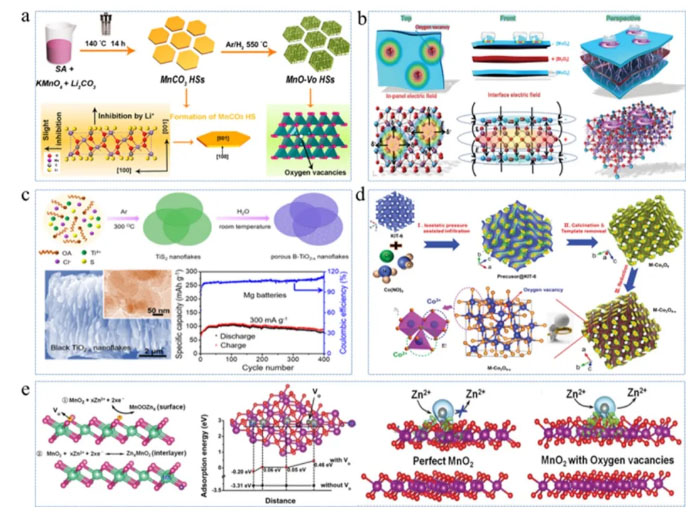 另外,過渡金屬氧化物(TMOs)作為金屬離子電池常見的負(fù)極材料,具有理論容量大、價(jià)格低廉等優(yōu)點(diǎn),近年來引起了廣泛的關(guān)注。在這些材料中,倍率、容量和循環(huán)穩(wěn)定性往往受到離子擴(kuò)散差和電荷轉(zhuǎn)移慢的限制。在過渡金屬氧化物中,氧空位缺陷是目前最常見的陰離子缺陷,其形成能較低而且易于形成。氧空位的存在可有效地調(diào)控過渡金屬氧化物的表面電子結(jié)構(gòu)和物理化學(xué)性質(zhì),因此起著至關(guān)重要的作用。在二次電池中,氧空位缺陷的形成能夠誘導(dǎo)金屬氧化物中的電子結(jié)構(gòu)發(fā)生變化,從而影響電子和離子的傳輸。并且在電極/電解液界面處,氧空位的存在不僅可以通過改變表面熱力學(xué)來促進(jìn)鋰化過程中的相變,而且可以很好地保持電極表面形貌的完整性,從而改善材料在充放電過程中的倍率性能和循環(huán)性能。例如,已經(jīng)有研究表明,具有氧空位缺陷的二氧化鈦、二氧化錫、氧化錳等氧化物作為鋰離子電池負(fù)極材料可以有效地提高電池的循環(huán)穩(wěn)定性以及倍率性能,從而提升電池的電化學(xué)性能。