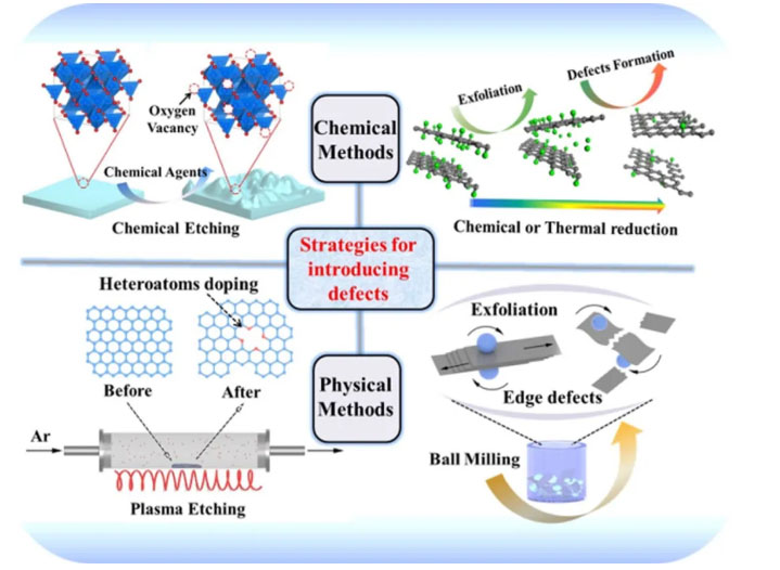 在晶體材料中引入缺陷會(huì)顯著改變材料的電子結(jié)構(gòu),影響材料的物理化學(xué)性質(zhì)。因此,有效地構(gòu)筑缺陷,理解缺陷形成的內(nèi)在機(jī)制至關(guān)重要。目前構(gòu)筑缺陷的方法很多,如圖2所示,主要有化學(xué)策略(化學(xué)還原和蝕刻)和物理策略(等離子體技術(shù)和機(jī)械球磨)。