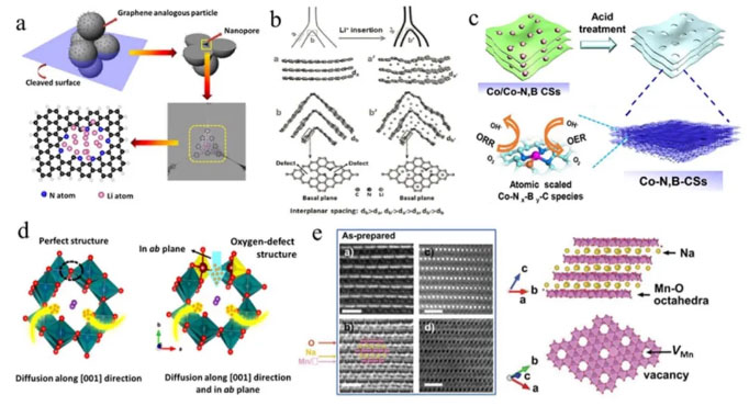 以鋰離子電池為例,當(dāng)充電時(shí),鋰離子從正極脫出,通過電解液嵌入負(fù)極,而放電過程則相反。因此,電池的容量直接取決于活性物質(zhì)和金屬離子的儲(chǔ)存位點(diǎn)數(shù)量。在負(fù)極材料中,具有良好穩(wěn)定性和低成本的碳基材料得到了廣泛的研究。由于其具有層狀結(jié)構(gòu),可以提供金屬離子快速傳輸?shù)耐ǖ溃谘h(huán)過程中能夠保持結(jié)構(gòu)的完整性,在充放電過程中體積膨脹小,因此具有良好的倍率和循環(huán)性能。但是,由于金屬離子的存儲(chǔ)位置有限,擴(kuò)散動(dòng)力學(xué)較差,使得材料的理論容量相對(duì)較低。近年來的許多研究表明,在碳材料中構(gòu)筑缺陷可以提供更多的活性位點(diǎn)和離子存儲(chǔ)位點(diǎn),多余的金屬原子可以容納在缺陷結(jié)構(gòu)中,從而提供更多的額外容量。
