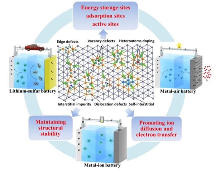 目前對(duì)電極材料的研究仍然存在一些問題制約其發(fā)展,對(duì)于金屬離子電池,常見的問題有導(dǎo)電性差、容量低以及循環(huán)穩(wěn)定性差等;對(duì)于鋰-硫電池,存在多硫化物的溶解和穿梭效應(yīng),阻礙了鋰硫電池的實(shí)際應(yīng)用;對(duì)于金屬空氣電池,氧電極上充放電反應(yīng)動(dòng)力學(xué)過程緩慢,極大地阻礙了金屬空氣電池的實(shí)際應(yīng)用。因此,合理設(shè)計(jì)具有豐富的存儲(chǔ)/吸附/活性位點(diǎn)的電極材料,提高其能量密度以及循環(huán)穩(wěn)定性是實(shí)現(xiàn)電化學(xué)能源存儲(chǔ)和轉(zhuǎn)換技術(shù)發(fā)展的關(guān)鍵。研究表明在電極材料中構(gòu)筑缺陷可以有效地改變晶體周期性結(jié)構(gòu)和影響周圍電荷分布,進(jìn)一步影響電極材料的物理化學(xué)性能。因此,研究電極材料中缺陷的可控構(gòu)筑以及理解缺陷在電化學(xué)反應(yīng)過程中的作用機(jī)制是十分必要的。