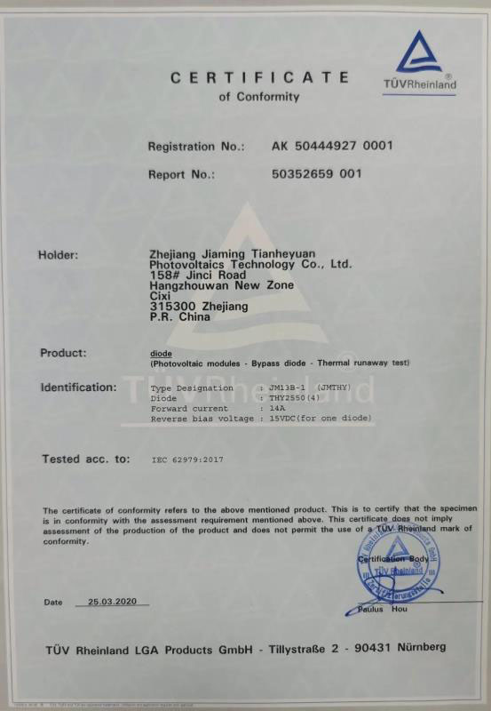 浙江佳明天和緣光伏科技有限公司副總經(jīng)理王福安表示道:“浙江佳明天和緣光伏科技有限公司始終致力于太陽能組件用接線盒、連接器及線纜的研發(fā)和制造,為客戶提供優(yōu)質(zhì)的產(chǎn)品和服務(wù)。此次通過TüV萊茵的二極管熱逃逸認(rèn)證測試,再一次表明了佳明產(chǎn)品的質(zhì)量穩(wěn)定可靠,希望雙方加強合作,互利共贏,繼續(xù)推進太陽能光伏事業(yè)的健康、穩(wěn)定的發(fā)展”。