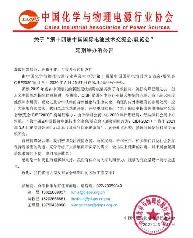 由中國(guó)化學(xué)與物理電源行業(yè)協(xié)會(huì)主辦的“第十四屆中國(guó)國(guó)際電池技術(shù)交流會(huì)/展覽會(huì)CIBF2020"原計(jì)劃于2020年5月25-27日在深圳會(huì)展中心舉辦。