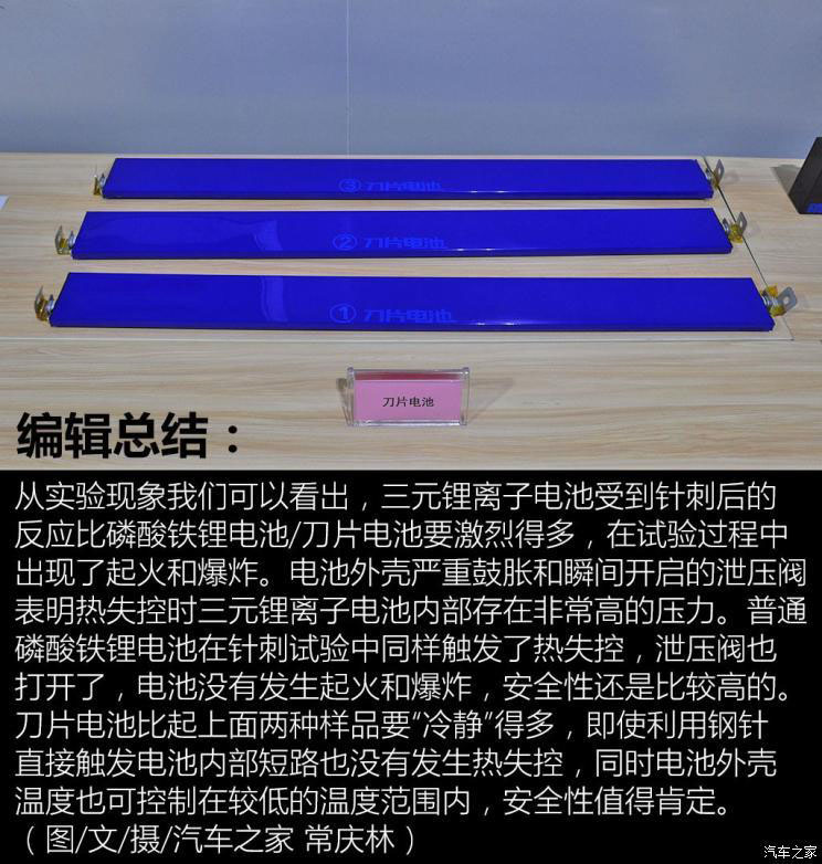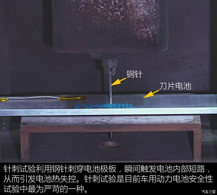 即將應(yīng)用在比亞迪漢車型上的刀片型磷酸鐵鋰電池(下稱“刀片電池”),通過無模組電池成組方式,提升了電池包的整體能量密度,進(jìn)一步延長了車輛續(xù)航里程,在續(xù)航里程上追近了采用三元鋰離子電池的主流車型。加上目前基于磷酸鐵鋰電池的刀片電池在安全性和抗容量衰減特性上相比三元鋰離子電池更有優(yōu)勢,使其重新獲得乘用車消費(fèi)者的關(guān)注。最近比亞迪電池實(shí)驗(yàn)室對刀片電池進(jìn)行了嚴(yán)酷的針刺試驗(yàn),作為對比,現(xiàn)場也對普通磷酸鐵鋰和三元鋰離子電池樣品進(jìn)行了同樣的試驗(yàn)。下面就讓我們來看看這三種電池被鋼針刺穿后會發(fā)生什么?