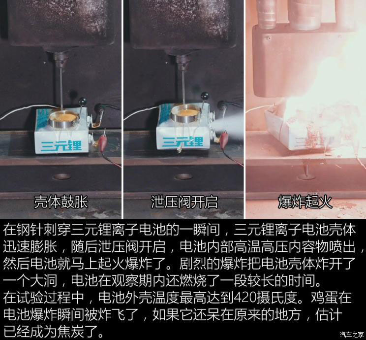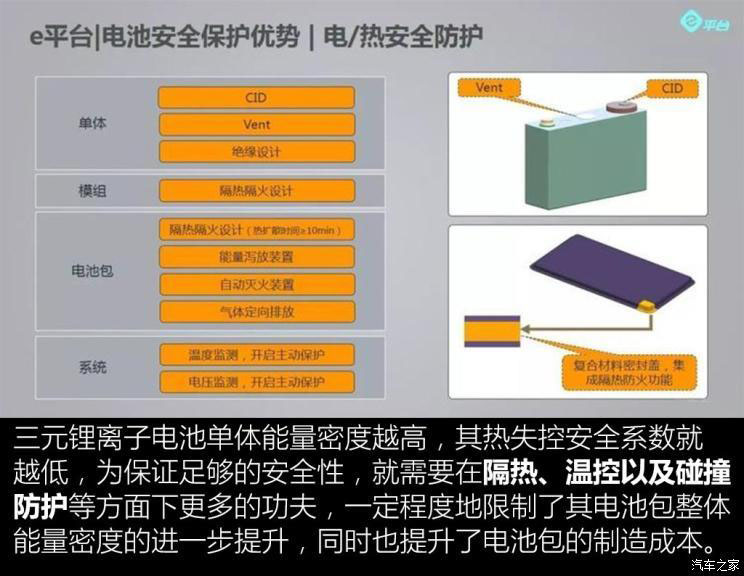 看到這里,可能有些買了搭載三元鋰離子電池純電動車的朋友開始坐不住了,是不是要換一臺搭載磷酸鐵鋰電池的車型更安全呢?且慢,上述試驗(yàn)是電池單體的零部件安全試驗(yàn),雖然三元鋰離子電池單體安全系數(shù)較低,但通過電池包結(jié)構(gòu)設(shè)計優(yōu)化以及電池管理系統(tǒng)的嚴(yán)格監(jiān)控,是能夠提升該類型電池在電池包級別的安全系數(shù)的,請各位繼續(xù)往下看。