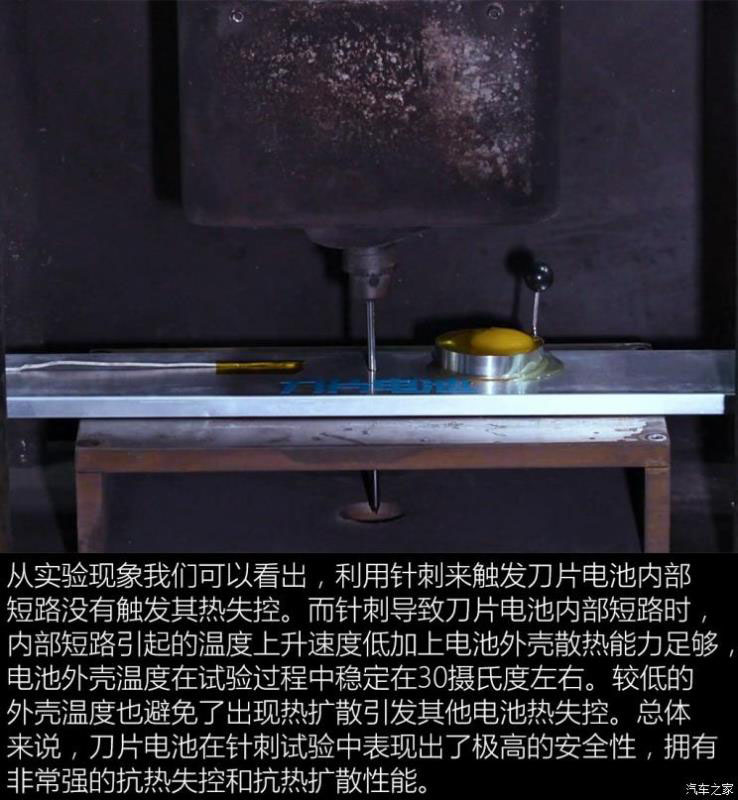 此次針刺試驗(yàn)是在比亞迪的電池實(shí)驗(yàn)室內(nèi)進(jìn)行的,由于實(shí)驗(yàn)室保密和安全原因,我們不能拍攝電池針刺的過程,所以通過官方采用實(shí)驗(yàn)室專用的監(jiān)控攝像頭拍攝的視頻進(jìn)行講解。