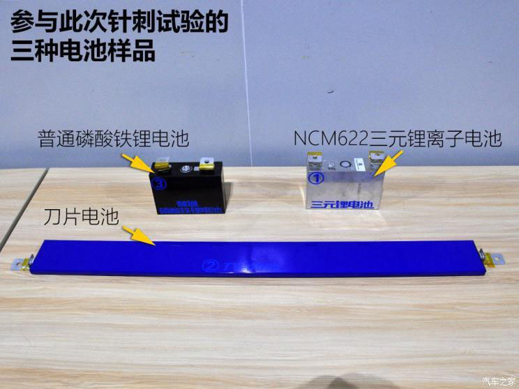 此次針刺試驗(yàn)除了有比亞迪最新的刀片電池外,作為對比,我們也找來普通磷酸鐵鋰電池、NCM622三元鋰離子電池(正極材料中的鎳鈷錳三種成分的比例為6:2:2)進(jìn)行試驗(yàn)。我們要看看這三種電池在嚴(yán)酷的針刺試驗(yàn)下,都有怎樣的表現(xiàn)。