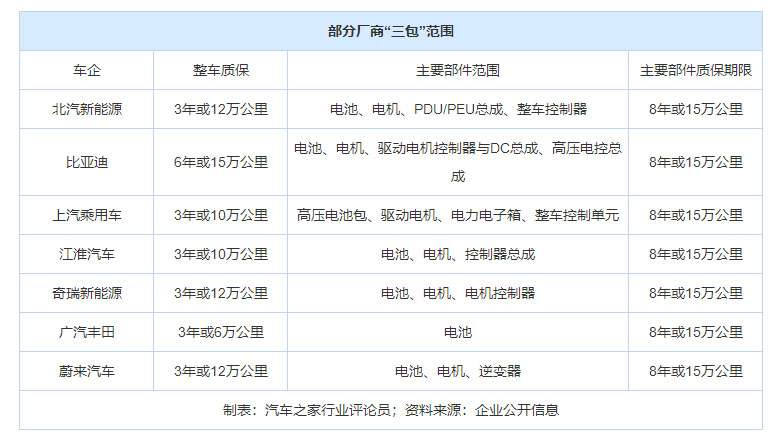 即便如此,但公允地說,汽車廠商對新能源汽車主要零部件的質保期限普遍要高于《汽車三包規(guī)定》。這一方面是受國家新能源汽車國補政策的要求,另一方面也是企業(yè)讓消費者放心的措施。但是,不為新能源汽車設立專門的“三包”規(guī)定也出現了許多問題,其中最突出的一點是,各個廠家對于提供”三包“的主要部件的范圍差別較大,如下表所示。
