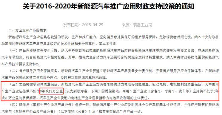目前,廠商關于新能源汽車的質保標準,是按照2015年時發(fā)布的《財政部、科技部、工業(yè)和信息化部、發(fā)展改革委關于2016-2020年新能源汽車推廣應用財政支持政策的通知》(以下簡稱“2015年國補政策”)中的要求設定的,即對動力電池等儲能裝置、驅動電機、電機控制器的質量保證,乘用車是不低于8年或12萬公里(以先到者為準)。