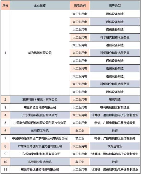 表:松山湖科技園大用電客戶