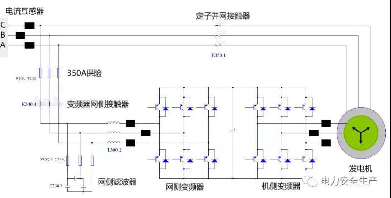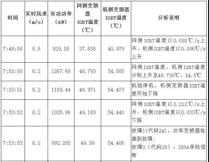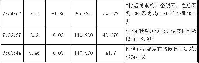 通過分析網(wǎng)側(cè)IGBT溫度突變的起始點(diǎn)、溫度達(dá)到極限值的終止點(diǎn)數(shù)據(jù)和故障信息可知,機(jī)組在正常運(yùn)行狀態(tài)下,網(wǎng)側(cè)IGBT突然出現(xiàn)內(nèi)部過流故障,造成IGBT內(nèi)部溫度檢測回路開路(開路會(huì)導(dǎo)致溫度達(dá)到極限值)。網(wǎng)側(cè)IGBT過電流,將直接沖擊上級回路的350A保險(xiǎn),導(dǎo)致保險(xiǎn)熔斷,機(jī)組報(bào)出保險(xiǎn)熔斷故障。6min后線路跳閘。