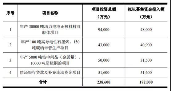 項(xiàng)目完成后,公司將新增年產(chǎn)5000噸金屬量鈷中間品、1萬(wàn)噸陰極銅,新增合計(jì)年產(chǎn)3萬(wàn)噸動(dòng)力電池正極材料前驅(qū)體及新增年產(chǎn)100噸高導(dǎo)電性石墨烯、150噸碳納米管的產(chǎn)能。