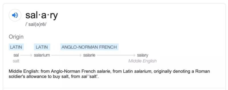 英語中的“to be worth one’s salt”一詞的意思是某人有能力,對得起他們掙的錢。據(jù)說這句話起源于古羅馬,士兵有時會得到鹽作為報酬或購買鹽的津貼。其實英語“Salary” (工資)這一詞來源于拉丁語 “salarium”,最初就是指士兵買鹽的津貼。