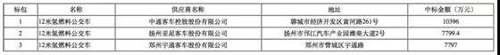 2020年1月19日,中通客車、亞星客車、宇通客車中標(biāo)濰坊市公共交通總公司100臺(tái)新能源公交項(xiàng)目,均為12米氫燃料公交車,中標(biāo)金額分別為10396萬(wàn)元、7799.4萬(wàn)元、7797萬(wàn)元,總金額近2.6億元,每臺(tái)單價(jià)約259.92萬(wàn)元。