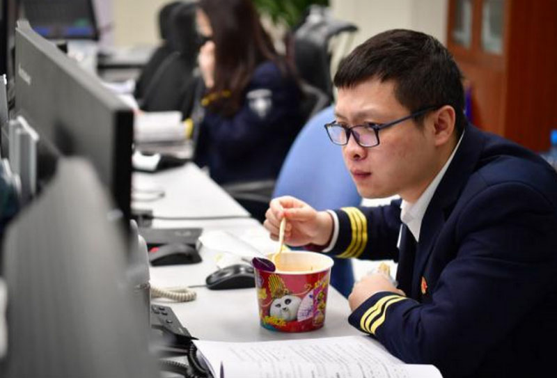 2月6日,調(diào)度大廳內(nèi),調(diào)度長(zhǎng)崔偉在吃飯間隙查看工作數(shù)據(jù)。
