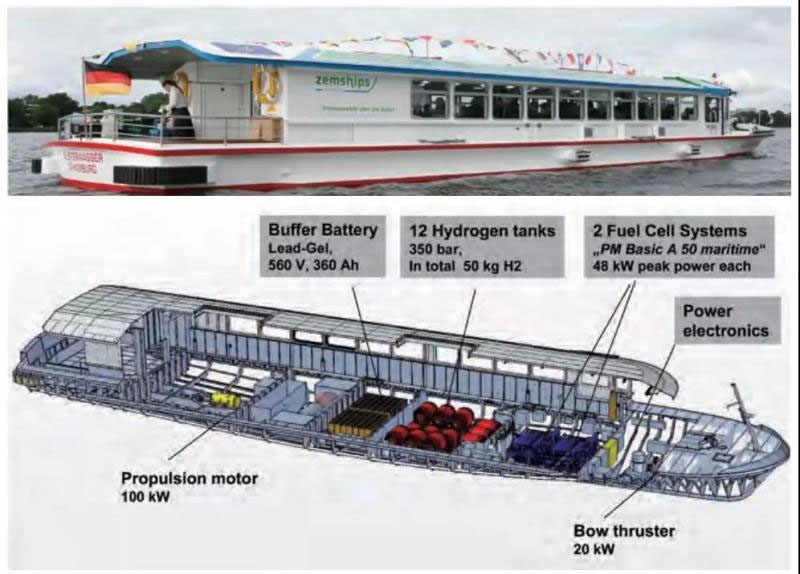 全球首個在商業(yè)客輪上使用燃料電池的項目ZEMSHIP項目起始中國船舶集團605院500kW級內(nèi)河氫燃料電池動力貨船 于 2007年,由歐盟 EU-Life項目資金資助,其目的是為了在環(huán)境敏感區(qū)域使用零排放的船舶并進行實際的測試,以推廣此技術(shù)在航運界更廣泛的應(yīng)用。該船整合了兩個峰值功率 48kW的燃料電池和 560V的鉛蓄電池,船長為 25.5米,船寬 5.25米,可以運送 100名乘客。該船于2008年 8月投入使用。