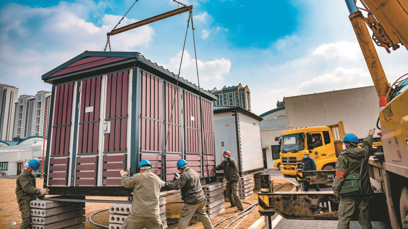 供電員工在雷神山醫(yī)院建設(shè)工地吊裝箱變。 左衛(wèi)兵 攝