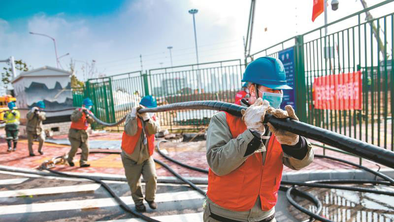 1月29日,供電員工在雷神山醫(yī)院建設(shè)工地敷設(shè)電纜。左衛(wèi)兵 攝