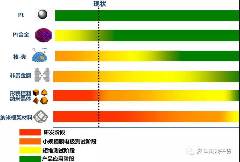 在過去的近十年內(nèi),已開發(fā)了多種有潛在應(yīng)用的陰極ORR催化劑,這些催化劑可大致分為:Pt/C催化劑、Pt合金催化劑、核-殼催化劑、非貴金屬催化劑、形貌控制納米晶體催化劑、納米框架催化劑。上述均為擔(dān)載型催化劑(催化劑擔(dān)載在碳載體或其他納米材料商)。由于3M公司開發(fā)的NSTF催化劑產(chǎn)品已停產(chǎn),且NSTF催化劑結(jié)構(gòu)獨立、無聚合物,不在本次討論之類。各種催化劑的大致開發(fā)和應(yīng)用進(jìn)展如下圖所示。注意,僅從車用角度看,非貴金屬催化劑可能因不符合性能、耐久性、穩(wěn)定性和功率密度要求,被認(rèn)為距離商用化應(yīng)用最遠(yuǎn)。但非貴金屬催化劑已接近便攜式電源應(yīng)用要求。從工業(yè)或商用角度看,每種催化劑都有其優(yōu)缺點。