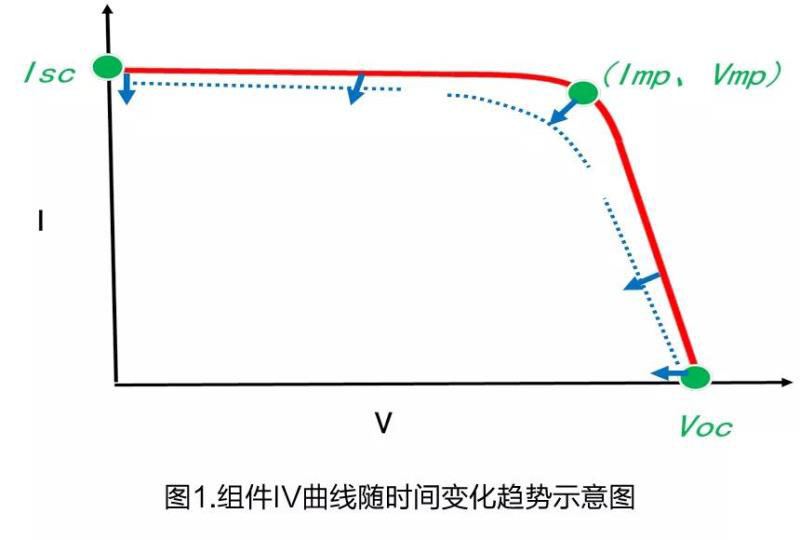 圖1為典型的組件IV曲線。運營期內,圖中所示的電學參數(shù),包括開路電壓(Voc)、短路電流(Isc)、運行電壓(Vmp)、運行電流(Imp),都會隨著時間推移按沿箭頭所示方向變化,填充因子(FF)和組件最大功率(Pmp)也會隨之變化。