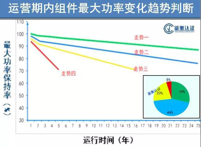 運營期內,組件最大功率的保證程度是業(yè)內最關心的問題,也是光伏電站能否取得預期收益的基礎。下圖為根據(jù)鑒衡對幾百種不同型號投用組件的監(jiān)測結果,對組件最大功率保證程度的總體分析和判斷。