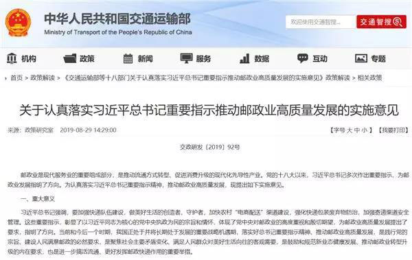 近日,交通運輸部、國家郵政局等18個部門聯(lián)合印發(fā)《關(guān)于認(rèn)真落實習(xí)近平總書記重要指示推動郵政業(yè)高質(zhì)量發(fā)展的實施意見》(簡稱《意見》)。《意見》立足當(dāng)前,著眼長遠(yuǎn),從全面深化改革、強化創(chuàng)新驅(qū)動、加快結(jié)構(gòu)調(diào)整、提高服務(wù)質(zhì)量、推動綠色發(fā)展、加強隊伍建設(shè)六個方面提出了18項重點任務(wù)。