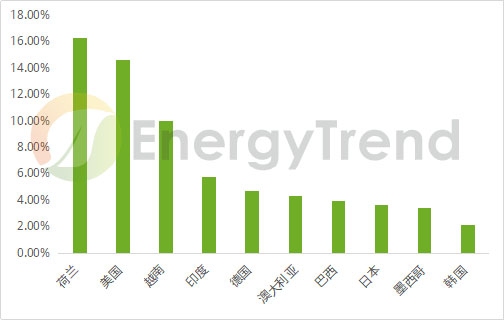 依國別來看,前五國出口金額占比50%。其中荷蘭、德國、韓國排名穩(wěn)中有升,荷蘭市場超過出口局勢搖擺不定的美國市場,登頂榜首。越南市場經(jīng)過上半年630搶裝,其出口金額占比已有下行趨勢。同時(shí)企業(yè)出口國家分布進(jìn)一步分散化,未來海外新興市場與復(fù)蘇的歐洲市場已成企業(yè)角力要點(diǎn)。