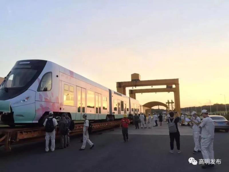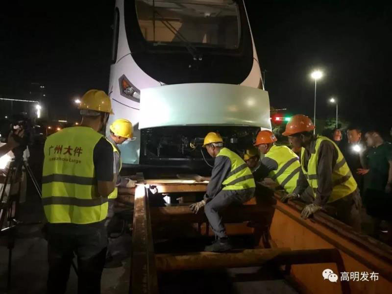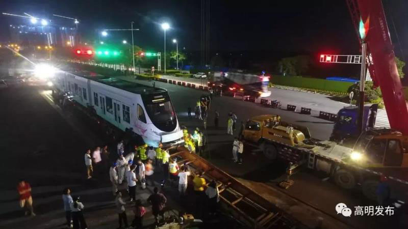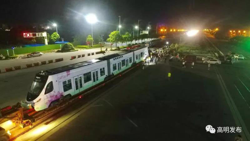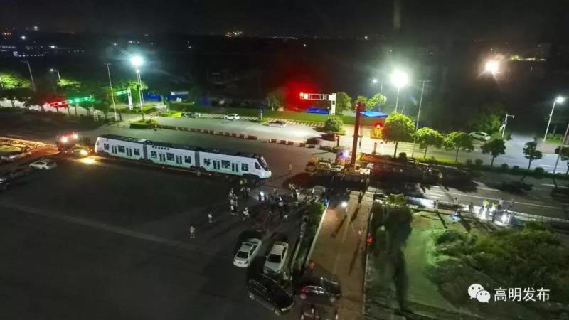 經(jīng)過組裝和調(diào)試后,當晚約10:00,運載有軌電車的列車從高明中車基地出發(fā),途徑大成路、怡樂路、荷富大道,運輸行車距離約10公里。