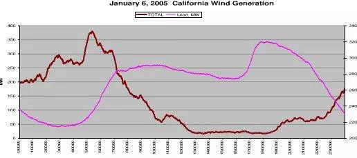 而且,夜晚用電負荷處于低谷時段風電發(fā)電出力往往較大,即使常規(guī)電源降出力,當風電規(guī)模達到一定程度(大于低谷用電負荷),也難免出現(xiàn)限電棄風。下圖為風電出力曲線和負荷需求曲線對照。