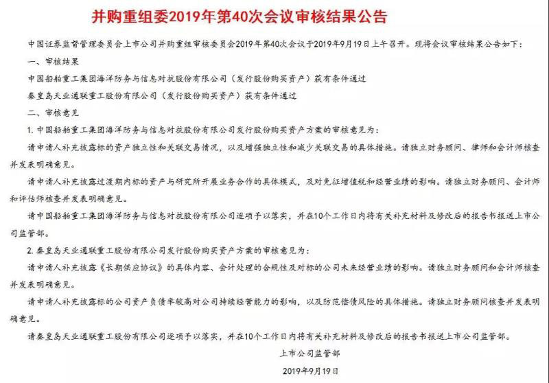 19日下午,證監(jiān)會網(wǎng)站發(fā)布《中國證券監(jiān)督管理委員會并購重組委2019年第40次會議審核結(jié)果公告》,秦皇島天業(yè)通聯(lián)(發(fā)行股份購買資產(chǎn))獲有條件通過。