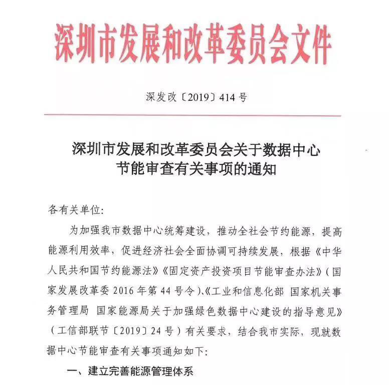 深圳市發(fā)改委發(fā)布了《深圳市發(fā)展和改革委員會關(guān)于數(shù)據(jù)中心節(jié)能審查有關(guān)事項的通知》,通知中要求各數(shù)據(jù)中心建設(shè)單位: