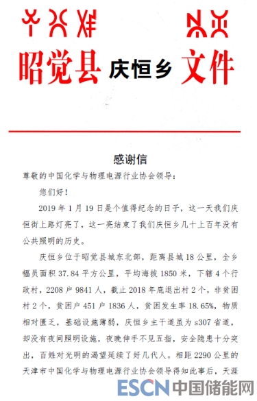 2019年中國化學(xué)與物理電源行業(yè)協(xié)會將繼續(xù)大力弘揚社會主義核心價值觀,大興友善互助、幫扶相助的社會風(fēng)尚。協(xié)會將攜手更多會員單位和相關(guān)企業(yè),不僅肩負(fù)社會組織和企業(yè)的發(fā)展職責(zé),更肩負(fù)起共同富裕的社會責(zé)任,在新能源的發(fā)展道路上拼搏前行。今年計劃為昭覺縣央摩祖鄉(xiāng)所在地安裝太陽能路燈,也熱忱歡迎會員單位和相關(guān)企業(yè)與我們一道,共同參與涼山彝族扶貧攻堅戰(zhàn),助力彝鄉(xiāng)百姓脫貧奔小康。