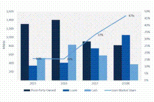 隨著大牌公司的市場份額有所下降,因為他們專注于盈利能力而不是客戶數(shù)量增加,現(xiàn)金市場由于客戶收購困擾國家安裝人員和行業(yè)的長尾而大幅下滑,貸款市場進入它自己的。像Mosaic這樣的新公司轉向SolarCity和Vivint Solar等現(xiàn)有公司開始提供太陽能貸款(如2015年12月和2016年6月),因此導致太陽能貸款市場在2017年爆炸并增長了81%。