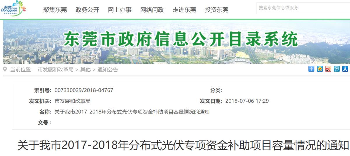 根據(jù)《關(guān)于組織申報2017-2018年東莞市分布式光伏發(fā)電資金補助項目的通知》(東發(fā)改〔2017〕49號),我市2017-2018年分布式光伏專項資金補助項目總?cè)萘繛?20MW,項目建成并網(wǎng)后按補助申請時間先到先得,現(xiàn)將我市補助項目容量有關(guān)情況通知如下: