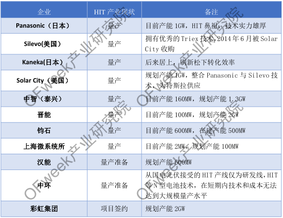 OFweek產(chǎn)業(yè)研究院數(shù)據(jù)顯示,在大規(guī)模量產(chǎn)方面,首屈一指的當(dāng)然是日本三洋,現(xiàn)有產(chǎn)能1GW,量產(chǎn)效率達23%。除此之外,有較成熟HIT技術(shù)的還有Keneka、Sunpreme、Solarcity、福建均石、晉能、中智(泰興)、漢能等企業(yè)。