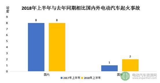 根據(jù)公開資料整理發(fā)現(xiàn),2018年上半年國內(nèi)外共發(fā)生電動汽車起火事故10起,涉及車輛總數(shù)10輛。其中,國內(nèi)起火事故8起、涉及車輛8輛,與去年同期持平;國外起火事故2起、涉及車輛2輛,與去年同期的1起事故相比增加1起。