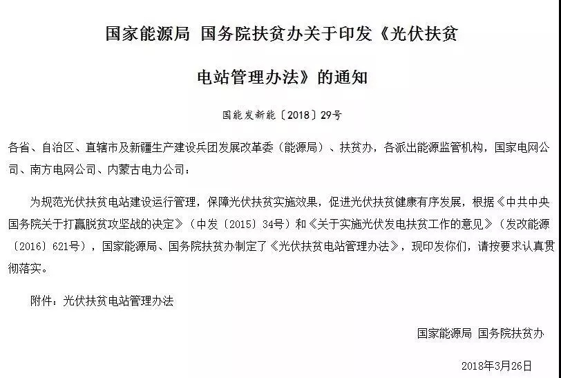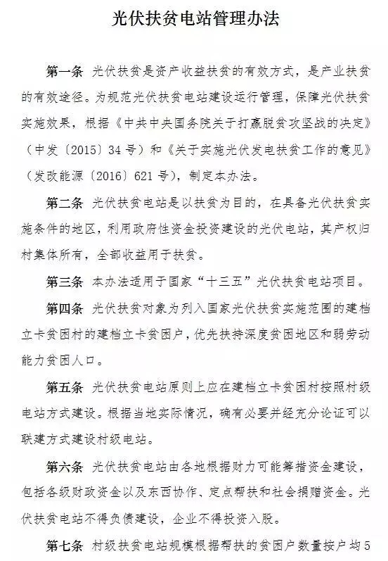 中國儲能網(wǎng)訊:4月9日,國家能源局重磅發(fā)布《光伏扶貧電站管理辦法》,明確了光伏扶貧電站其產(chǎn)權(quán)歸村集體所有,全部收益用于扶貧。且不得負(fù)債建設(shè),企業(yè)不得投資入股。