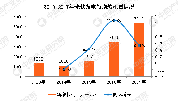 據(jù)統(tǒng)計(jì),2014-2015年我國(guó)光伏發(fā)電新增裝機(jī)量逐年穩(wěn)步上漲,特別是2016年我國(guó)光伏發(fā)電新增裝機(jī)容量3454萬(wàn)千瓦,同比增長(zhǎng)高達(dá)128.3%。初步計(jì)算,2017年光伏發(fā)電的新增裝機(jī)還是2016年的1.5倍、2015年的3.5倍、2014年的5陪和2013年的4倍,由此可見(jiàn)2017年光伏新增裝機(jī)出現(xiàn)了大幅快速增長(zhǎng)。