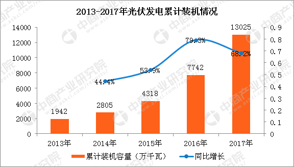 到2017年12月底,全國(guó)光伏發(fā)電裝機(jī)達(dá)到1.3億千瓦,其中,光伏電站10059萬(wàn)千瓦,分布式光伏2966萬(wàn)千瓦。而此前太陽(yáng)能“十三五”規(guī)劃的目標(biāo)僅105GW,已經(jīng)提前并超額完成了“十三五規(guī)劃目標(biāo)”?!笆濉币詠?lái),隨著太陽(yáng)電池技術(shù)進(jìn)步的快速提高,太陽(yáng)電池生產(chǎn)成本和光伏發(fā)電成本快速下降,在各項(xiàng)光伏政策的支持下,我國(guó)光伏發(fā)電市場(chǎng)繼續(xù)保持快速發(fā)展。