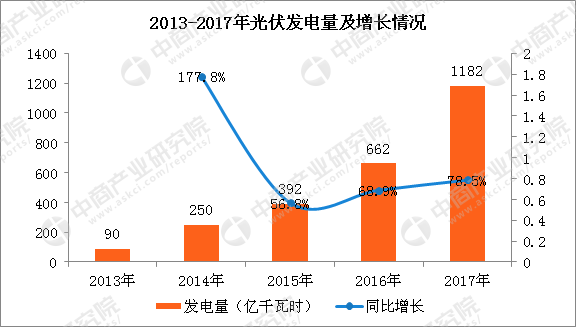 從發(fā)電情況來(lái)看:2017年,全國(guó)光伏發(fā)電量1182億千瓦時(shí),同比增長(zhǎng)78.6%,光伏發(fā)電量占全部發(fā)電量的比重由2016年的1.1%提高到1.8%。