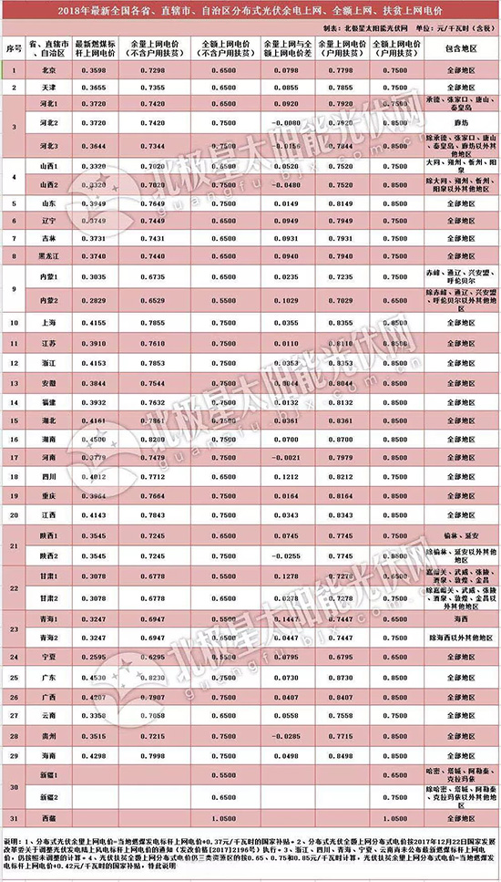 那么,如果按照新的執(zhí)行標(biāo)準(zhǔn),2018年全國各地區(qū)的分布式余量上網(wǎng)電價、全額上網(wǎng)和扶貧電價情況又是如何呢?北極星太陽能光伏網(wǎng)小跟班特意做了如下匯總。