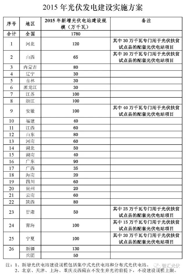 2015年3月16日,國(guó)家能源局下發(fā)《關(guān)于下達(dá)2015年光伏發(fā)電建設(shè)實(shí)施方案的通知》(國(guó)能新能[2015]73號(hào)),下發(fā)了17.8GW的規(guī)模指標(biāo),包含1.5GW的扶貧指標(biāo),地面電站和分布式光伏的指標(biāo)合并在一起。