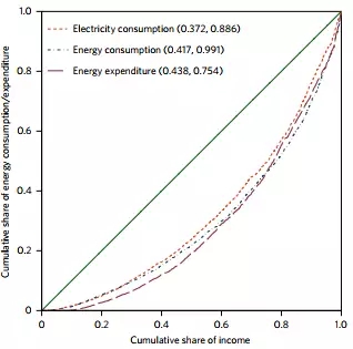 能源的洛倫茲曲線,X軸表示的是家庭收入的累積百分比,Y軸表示能源消耗的的累積百分比。括號(hào)中的兩組數(shù)據(jù)分別是基尼系數(shù)和洛倫茲不對(duì)稱系數(shù)。