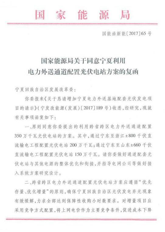 中國儲能網(wǎng)訊:9月6日,國家能源局對于寧夏發(fā)改委的《關(guān)于懇請增加寧夏電力外送基地配套光伏發(fā)電項目的請示》進行了函復(fù)。文件指出,原則上同意寧夏自治區(qū)利用跨省跨區(qū)電力外送通道配置350萬千瓦光伏電站的方案。文件要求跨省跨區(qū)電力外送通道配置光伏電站應(yīng)遵循“優(yōu)先存量、優(yōu)化增量”的原則,對增量項目應(yīng)當(dāng)采用競爭方式配置,將上網(wǎng)電價作為主要競爭條件。此次利用跨省跨區(qū)電力外送通道配置光伏電站的規(guī)模共計350萬千瓦,或?qū)⒁欢ǔ潭壬暇徑鈱幭牡貐^(qū)的棄光問題。