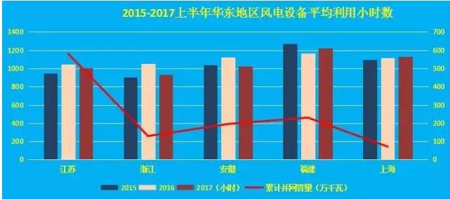 從風(fēng)電設(shè)備利用率上看,由于處于負(fù)荷中心,華東地區(qū)風(fēng)電設(shè)備平均利用小時數(shù)普遍高于全國平均水平,僅浙江省略低,為933小時。但是華東區(qū)域風(fēng)電消納壓力依然存在,其中江蘇、浙江、安徽風(fēng)電設(shè)備平均利用小時數(shù),依然分別低于去年同期42小時、120小時、100小時。