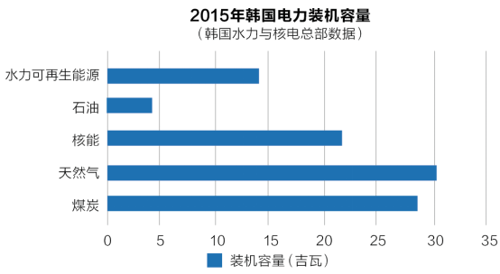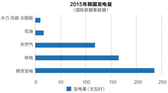 如下表所示,2015年,韓國電力總產(chǎn)量為549太瓦時,煤炭為236太瓦時,核電為165太瓦時,天然氣為118太瓦時,石油為16.5太瓦時,水力發(fā)電為6太瓦時,風(fēng)能和太陽能為3.8太瓦時。