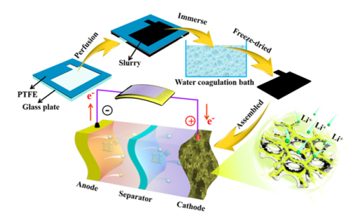 納米級活性物質(zhì)顆粒因其比表面高、離子/電子傳輸路徑短,在電化學(xué)儲能領(lǐng)域受到了廣泛的關(guān)注。但隨著電極負(fù)載量的增加,納米顆粒易從電極中脫落,限制了其在柔性儲能器件中的應(yīng)用。該團(tuán)隊于2016年首次報道了“相轉(zhuǎn)化”的方法制備具有優(yōu)異粘結(jié)強(qiáng)度和電子/離子傳質(zhì)能力的“三連續(xù)”柔性電極 (Adv. Funct. Mater., 2016, 26, 8427-8434),很好地解決了上述問題,并成功應(yīng)用于柔性鋰硫電池和鋰離子電池,為基于納米顆粒的高負(fù)載量電極的制備提供了新思路。
