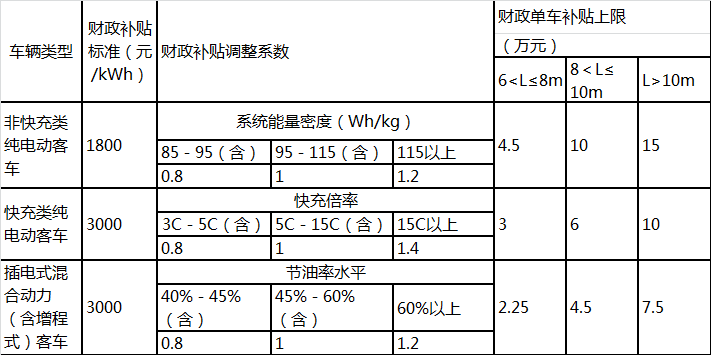1、新能源公交車補(bǔ)貼金額=車輛帶電量x單位電量補(bǔ)貼標(biāo)準(zhǔn)x調(diào)整系數(shù)(調(diào)整系數(shù):系統(tǒng)能量密度/充電倍率/節(jié)油水平),具體如下: